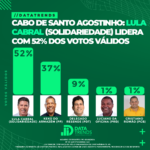 A corrida eleitoral no Cabo de Santo Agostinho segue cada vez mais definida em favor de Lula Cabral (Solidariedade), que lidera com ampla vantagem, conforme a pesquisa divulgada nesta quinta-feira, 26 de setembro, pelo instituto Data Trends. O levantamento aponta que Lula Cabral detém 52% dos votos válidos, consolidando sua posição como favorito na disputa pela Prefeitura do Cabo.